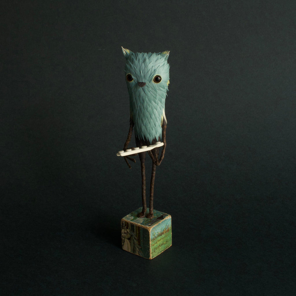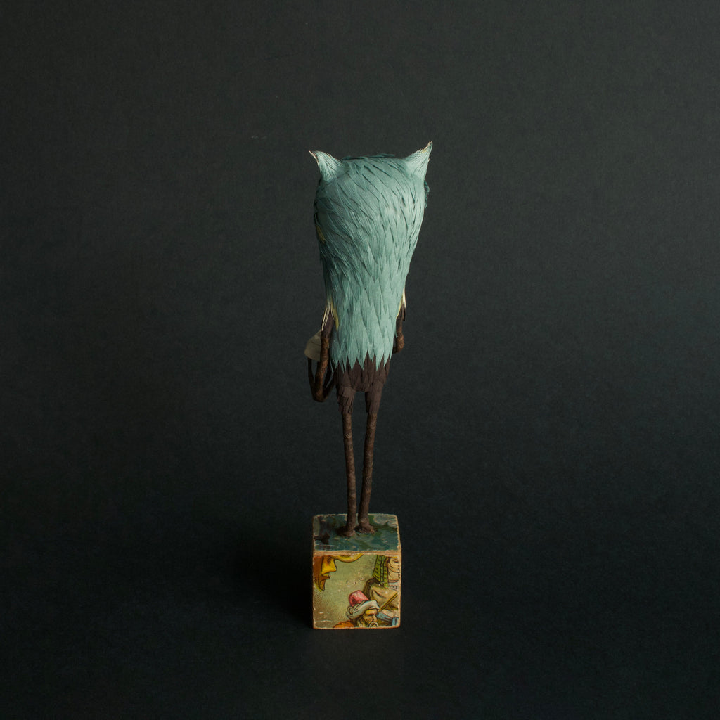 Japanese paper, wire, glass eyes, beach plastic on antique toy cube