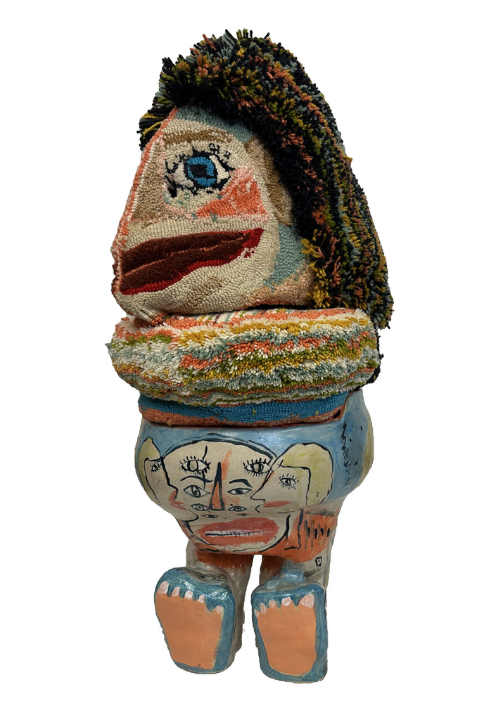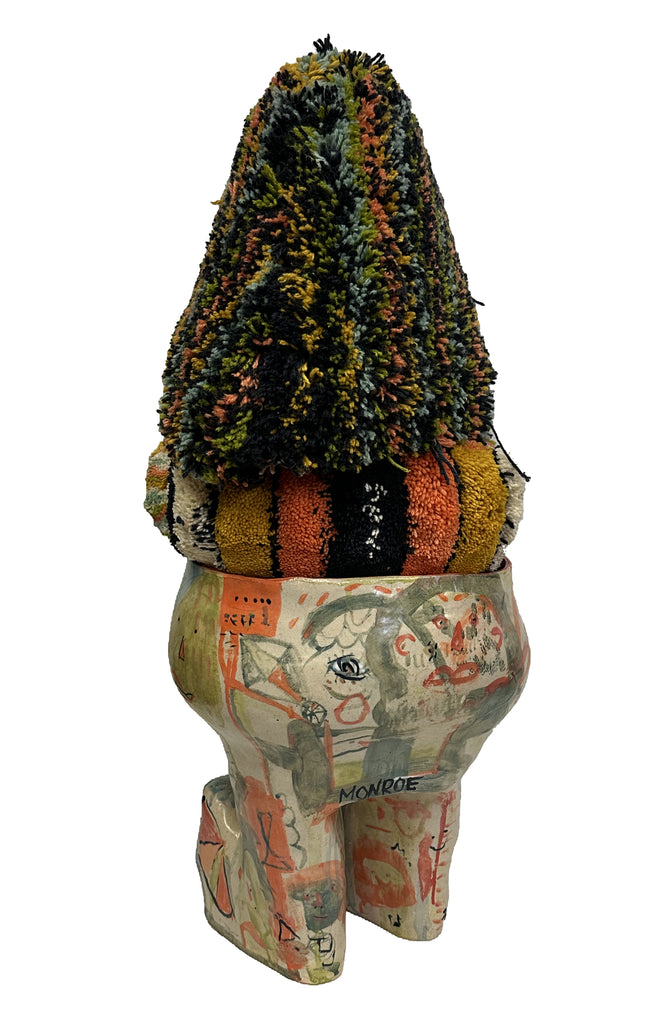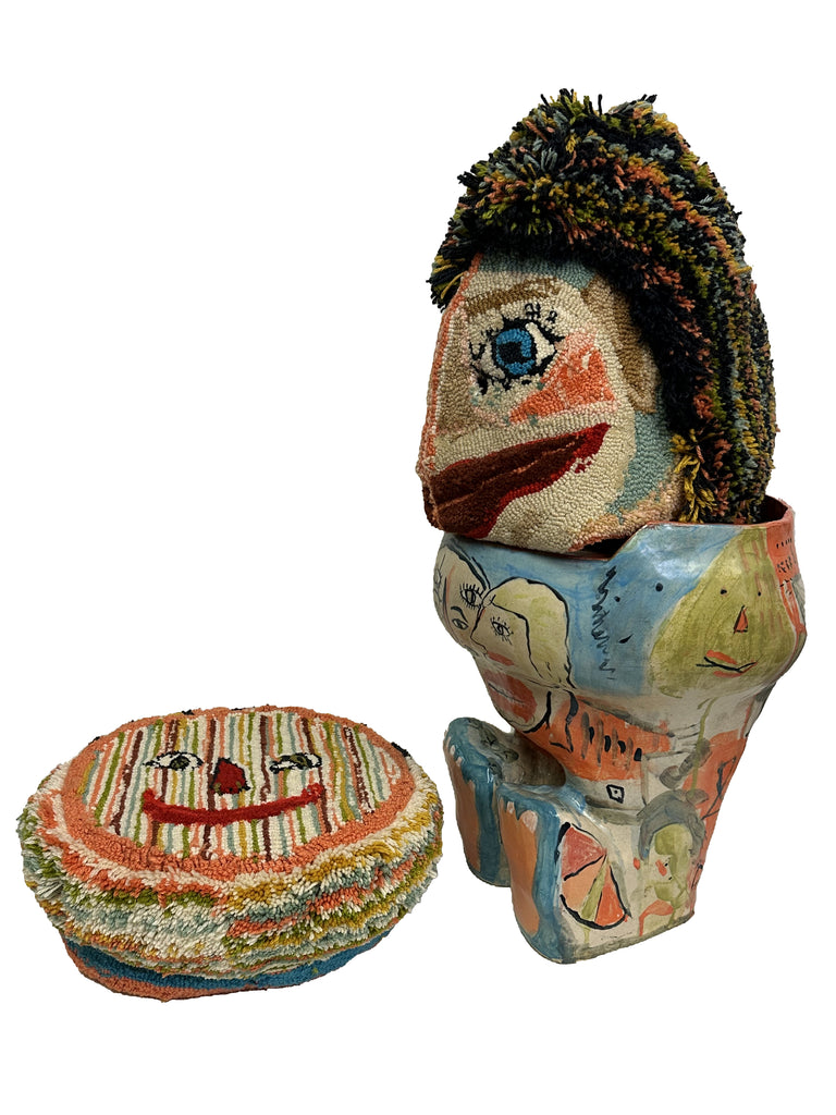 Ceramic glazed stool, tufted wool hand-sewn mask and cushion